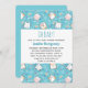 Baby shower invitation avec un mignon motif de chat, mis sur un arrière - plan bleu et décoré avec des arcs-en-ciel et des empreintes de pattes et plus encore.