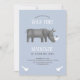 Un rhinocéros mignon et quelques oiseaux décorent cette invitation de fête de premier anniversaire de safari bleu neutre pour le genre. Le fond est orné d'un motif de rhinocéros. Personnalisez en changeant le nom, l'âge et le texte pour convenir à votre célébration.