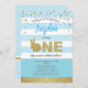Invitation de fête thème lapin mignon bleu et or pour le premier anniversaire de bébé garçon.