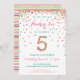 Célébrez l'anniversaire de votre enfant de 5 ans avec des confettis colorés or, rose, menthe et sarcelle sur ces invitations d'anniversaire 5 ans ! Avec les détails de la fête de votre fille et un "5" en confettis. Le titre indique "Oh Me, Oh My !" Jolies bandes colorées assorties au verso.