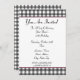 Une invitation simple avec un motif à carreaux gris charbon en haut et en bas de la face avant. Garniture rose et ruban noir en caractères gras. Personnalisez avec les détails de votre occasion. Le côté opposé présente un design uni avec une forme de cercle au milieu, encadrant le texte.