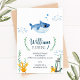 Invitation à une fête d'anniversaire avec un thème sous-marin pour l'anniversaire d'un enfant. Cette invitation comporte un bébé requin aquarelle mignon peint à la main et des éléments nautiques comme une ancre. Parfait pour une fête d'anniversaire pour enfants.