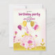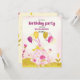 Une invitation d'anniversaire avec un lapin. Un lapin mignon dans une robe rose moelleuse avec fleurs et ballons. Une invitation à l'anniversaire pour une fille dans les tons rose et jaune. Illustration avec texture granuleuse et texture crayon.