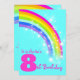 Invitation coloré graphique moderne mignon de partie d'arc-en-ciel et d'arc-en-ciel d'étoile dans l'aqua et le rose. Perfectionnez pour inviter les amies préférées de votre fille à sa fête d'anniversaire. Customisez avec vos propres détails et âge. Uniquement conçu et illustré par Sarah Trett.