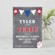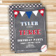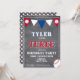 Cute Chalkboard Baseball 3ème anniversaire Invitation // Carte de fête d'anniversaire de baseball mignonne pour le 3ème anniversaire. L'aménagement comporte un grand baseball et des drapeaux de bunting en rouge, blanc et bleu sur l'arrière - plan du tableau de bord. A l'arrière se trouve un motif de baseball. Personnalisez cet invitation d'anniversaire avec le nom d'un enfant et personnalisez toutes les données de l'invitation. Super comme une invitation de fête de 3ème anniversaire pour un garçon.