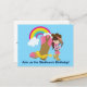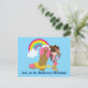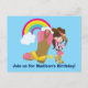 Carte d'invitation d'anniversaire de cowgirl mignonne représentant une petite fille habillée en rose appuyée contre une botte de cowboy et inclinant son chapeau. L'arc-en-ciel sur fond de ciel bleu apporte une touche charmante à cette invitation de fête de rodéo personnalisée.