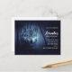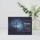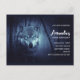 Carte postale d'invitation d'anniversaire avec une image d'un loup mystique magique debout dans une forêt avec une neige douce qui tombe autour.