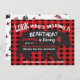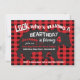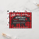 Super amusant boho tribal Bear invitation anniversaire avec grand ours noir, fontes amusantes et un arrière - plan flanelle rouge. L'arrière comporte des flèches et des empreintes de pieds griffés. Illustration tirée à la main par McBooboos