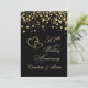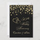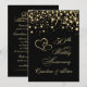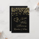 Invitation d'anniversaire de mariage avec cœurs joints dorés et confettis ronds sur fond noir