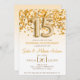 Ceci est une invitation à une fête d'anniversaire de mariage de 15 ans avec un thème de paillettes dorées et de confettis. 15