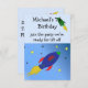 Une fusée spatiale brillante en bleu, rouge et vert qui explose sur la lune. Arrière - plan bleu avec un ciel étoilé. Customisez avec toutes les informations d'anniversaire de vos enfants comme vous le souhaitez.