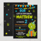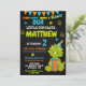 Piétinez, croquez, grognez et rugissez avec cette invitation d'anniversaire de dinosaure amusante ! Caractéristiques d'un T-Rex vert mignon avec un chapeau de fête, un fond de tableau noir avec des couleurs vives et des empreintes de dinosaure. Parfait pour les fêtes d'anniversaire sur le thème des dinosaures pour garçons ou filles. Conception ludique avec des fanions et des empreintes de pattes. Idéal pour les enfants qui aiment les dinosaures, le T-Rex et les aventures préhistoriques. Créez un bon moment de rugissement pour le jour spécial de votre petit dinosaure !