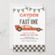Fast One Race Car 1er Anniversaire Invitation avec voiture de course bleu rétro.