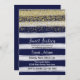 Invitation d'anniversaire avec parties scintillant dorée design et arrière - plan d'aquarelle bleu marine rayures.