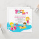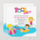 Commencez votre fête avec cette adorable invitation. Parfait pour la fête de la piscine de cette fille d'anniversaire. Il a un arrière - plan blanc. Il y a une grande piscine avec une adorable et mignonne petite fille sur le plongeoir. Elle a les cheveux blonds et un maillot de bain rose chaud. Elle a des lunettes roses sur la tête. Dans la piscine se trouve une jolie blonde aux cheveux qui flotte dans un radeau. À côté d'elle, un adorable garçon brun aux cheveux flottant sur un tube à points jaunes de polka. De l'autre côté du invitation se trouve le mot pool party. Les deux O dans la piscine sont des tubes colorés. Découvrez les nombreux autres produits et designs de cette ligne de fête de piscine. ©Illustrations JW