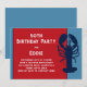 Invitation d'anniversaire sur papier kraft avec un homard bleu. Image de homard bleu foncé sur le côté droit d'un papier plat horizontal, avec de nombreuses options de papier et des mises à niveau. Un panneau rouge contient le texte imprimé en blanc (apparaît beige sur le papier kraft) et bleu marine. Ce design est parfait pour célébrer son anniversaire avec un grand festin de fruits de mer ! Vous pouvez également choisir le téléchargement instantané si vous préférez.