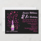 Fun festif invitation à la fête du 21ème anniversaire faite en noir, avec deux tons de texte rose. Des graphismes amusants d'une bouteille de champagne rose, avec des étoiles tournantes et des banderoles qui l'entourent, décorent le côté gauche de l'invitation. Le texte est prêt à être personnalisé pour votre grande journée. Customisez d'ajouter du texte à l'arrière de la carte.