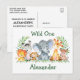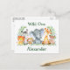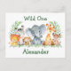 Carton d'invitation de fête d'anniversaire Safari Jungle Animaux Wild One première année. Les bébés animaux comprennent l'éléphant, le singe, la girafe, le rhinocéros, le zèbre et le lion sur des feuilles de fougère. Botanique aquarelle verte. Texte vert.