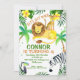 Vous cherchez une invitation pour un safari sauvage ou un anniversaire d'animaux de la jungle ? Ce joli design présente quatre animaux de safari ou de jungle en aquarelle sur un arrière - plan blanc. Le design présente quelques feuillages, des arbres et des pois verts clairs. Pour plus de dessins dans ce thème, veuillez visiter le magasin. Le safari sauvage de ce garçon ou l'invitation sauvage à la fête d'anniversaire est prêt à être personnalisé.