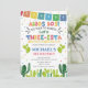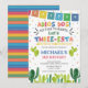Apportez la fiesta au grand jour de votre petit avec cette invitation d'anniversaire amusante Three-esta ! Parfait pour une fête d'anniversaire de 3 ans remplie de tacos, de musique et de couleurs. Ce modèle éditable présente un design inspiré du Mexique, des couleurs vives et des illustrations festives qui donnent le ton à une célébration joyeuse.