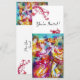 Invitation d'art raffiné colorée, élégante et vibrante. Danseurs de carnaval romantiques : figures de danse artistiques, fantaisistes et expressives, belle femme blonde en costume à plumes scintillantes dansant avec un jeune Arlequin avec des ornements rouges bordeaux au verso de la carte. Peinture à l'aquarelle dans des couleurs vives rose, fuchsia, vert, rouge, bleu, jaune, paillettes dorées inspirées de la Comédie de l'Art (Commedia dell'arte) et du Carnaval de Venise. C'est également un beau design pour les faire-part de mariage, les programmes, les "save the date", les anniversaires de mariage, les rassemblements, les fiançailles romantiques, les douches de mariée, les occasions spéciales, les fêtes de fin d'année, le bal masqué de Mardi Gras, les fêtes d