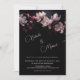 This dark moody romantic wedding invitation features light pink magnolia flowers on a black background. Bride and groom first names in an elegant classic calligraphic script.