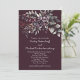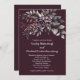 This wedding invitation showcases a rich, dark wine background that sets a tone of elegance and depth. At the top, a graceful floral arrangement unfurls in a mix of dusty purple blooms, soft lavender accents, and muted sage green leaves. The palette feels romantic and refined, with each shade contributing to a sense of quiet sophistication.