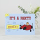Invitations d'anniversaire d'avion avec un avion rouge et une bannière. Ajoutez le nom de l'Enfant et les détails de la fête à cette invitation amusante.