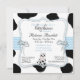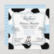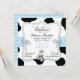 L'invitation de cowboy de vache a la copie de vache dans le noir avec la copie de chevron aux nuances du bleu. Notre vache minuscule place au milieu en bas avec des boutons tenant les rubans minuscules de corde de chaque côté.