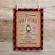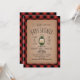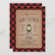 Une invitation baby shower avec l'illustration d'une lanterne de camping verte. Personnalisez le texte. Arrière - plan est rouge et noir bûcheron plaid inspiré de buffalo plaid motif.