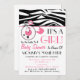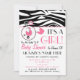 Une invitation de baby shower comportant une frontière supérieure de copie de zèbre avec l'équilibre rose. La goupille rose de couche-culotte attachée à la frontière supérieure et le cercle forment avec la voiture d'enfant rose à l'intérieur. Personnalisez le texte rose et noir avec des détails de votre occasion.