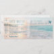 Coucher de soleil océanique rose et pêche sur des vagues bleu turquoise sur un fond de plage de sable lisse sur un thème de billet de carte d'embarquement pour une invitation de mariage à la plage qui comprend une carte RSVP que les invités peuvent découper et renvoyer. Il y a de la place au dos pour les informations de voyage et d'hôtel.