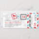 Une carte d'embarquement a inspiré l'invitation de billet avec des détails de timbre de passeport d'amusement et des rayures de par avion. Montré dans les nuances de l'Aqua, rouge lumineux, noir, gris-foncé et gris-clair. L'arrière inclut l'espace supplémentaire pour n'importe quelle information d'hôtel, de voyage ou de site Web.