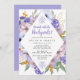 Des fleurs violettes et bleues élégantes créent un cadre en forme de diamant pour entourer les détails de votre brunch d'après-mariage.