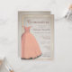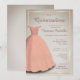 Cette invitation de célébration/ fête de quinceañera présente une belle robe rose clair sur fond beige avec un cadre doré (non en feuille).