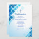 Une invitation contemporaine aux carrés d'angle dans les tons bleus. La croix en vedette peut être traînée à n'importe quel endroit, rendue plus grande ou plus petite (+_) ou éliminée. (FP)<br/>() La carte est facile à customiser avec votre libellé, police, couleur de police et choix de six types de papier.<br/>() Pas exactement ce que vous cherchez? Tous nos produits peuvent être conçus sur mesure pour répondre à vos besoins sans frais supplémentaires.<br/>() Il suffit de nous contacter à askpixieprints@aol.com . (a) (b) Coordonner les produits disponibles :