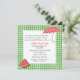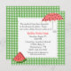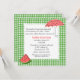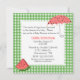 Invitation carrée de baby shower de bonbon faite dans un motif vert et blanc de guingan, avec un secteur blanc cranté par carré des textes de bord, au milieu. Les graphiques colorés d'une tranche de pastèque, décore en bas à gauche le faisant le coin de l'invitation et un parapluie fait dans des couleurs de pastèque décore le coin haut droit. Personnalisez texte fait sur commande de rose noir et saumoné pour adapter à vos besoins de douche. Belle invitation que la maman à être aimera et se perfectionnera pour un baby shower d'heure d'été.