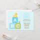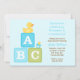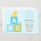 Cette invitation mignonne de baby shower comporte des blocs bleus et verts de bébé, un mignon en caoutchouc et une tétine. Cette invitation moderne et d'amusement de baby shower est parfaite pour que n'importe quelle maman soit.