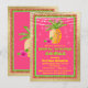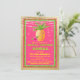 Invitation de douche de mariée tropicale avec joli ananas et fleur d'hibiscus sur un beau fond de papier alu rose chaud, vert citron et or avec des guirlandes lumineuses. Cette invitation de douche de mariée de soirée luau est facilement personnalisable pour votre événement en ajoutant simplement vos détails dans le style de police et la formulation de votre choix. Il s'agit d'un design imprimé sans véritable feuille d'aluminium, paillettes, etc.