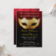 Invitation de fantaisie de célébration de mariage de mascarade. Une fantaisie et une invitation élégante comportant un or modifié la tonalité déguisent le masque avec des flourishes noirs là-dessus, un arrière - plan modifié la tonalité par canneberge avec un motif subtil de damassé recouvert dans le type de noir et de fantaisie qui est personnalisable pour vos détails de partie.