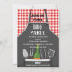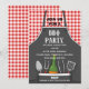 Cette conception présente un fond à carreaux rouges avec un tablier rempli de tous les essentiels d'une fête BBQ. Facile à personnaliser avec vos informations de fête. Parfait pour toutes les occasions.