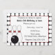 Une invitation mignonne de fête d'anniversaire comportant des goupilles de bowling et une frontière noire et blanche de point de polka