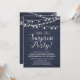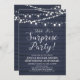 Célébrez votre jour spécial avec cette invitation de fête d'anniversaire de mariage surprise en bois rustique ! Ce design présente une typographie de script stylée " Chut... Fête surprise !" et des guirlandes lumineuses sur un fond de bois rustique bleu. Parfait pour une fête de jardin, une fête de grange ou toute fête surprise.