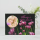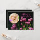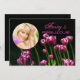 Une invitation dramatique comportant des tulipes de roses indien avec des bouts de blanc et une fenêtre circulaire de photo pour votre photo préférée sur un fond noir.