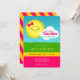 Ton petit soleil fait-il une fête d'anniversaire ? Faites-en un événement lumineux et heureux avec l'Invitation de fête d'anniversaire Pink and Yellow Sunshine conçue par Enchantfancy Design Company. Ce mignon invitation de 5" x 7" est doté d'un soleil souriant portant un arc rose ceint. Ciel bleu, herbe verte et une petite cravate nuageuse blanche ensemble la scène estivale. L'arrière de l'invitation d'anniversaire apparaît avec des rayures diagonales jaune et rose vif. Une soirée à thème ensoleillée est un choix parfait pour les fêtes d'anniversaire pour enfants.