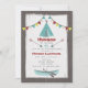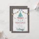Une invitation de fête d'anniversaire pour filles avec un thème de camping rustique. L'invitation comporte une illustration d'un tipi turquoise avec un motif chevron en haut et un canoë turquoise en bas. L'invitation présente également des fanions en haut et un fond inspiré du bois. Personnalisez le texte avec les détails de votre occasion.