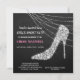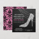 Cette invitation de fête de Bachelorette élégante présente une chaussure à talon aiguille en faux strass argenté ou diamant sur un fond noir dramatique. Derrière la chaussure se trouve une guirlande lumineuse scintillante. Votre texte personnalisé est en blanc et rose à gauche et en bas. Le dos de l'invitation a un motif damassé noir vintage sur fond rose assorti. Une combinaison de charme vintage et de flair moderne !