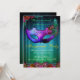 Invitation de fête de masquerade célébration paon. Une invitation élégante et chic présentant un masque de masquerade ton violet avec des fioritures noires et des faux rhinestones autour des yeux, un fond ombré bleu et vert avec un motif damassé subtil qui se fond dans le noir et un texte élégant qui est personnalisable pour les détails de votre fête. Des plumes de paon ornent le masque et les bords inférieurs de l'invitation.