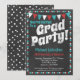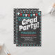 Une invitation funky de fête de remise de diplôme sur tableau noir aqua et rouge avec le texte en gras "Grad Party !" en haut avec un fond de tableau noir, des drapeaux et une bordure à pois mignonne.