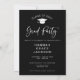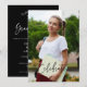 Montrez votre fierté avec cette invitation de fête de remise de diplômes simple et classique recto-verso. Le recto comporte une photo de votre diplômé, et le verso noir et blanc présente une typographie sans empattement et en script. Remplacez simplement la photo par celle de votre diplômé et ajoutez les détails. La couleur de fond noire peut être modifiée pour coordonner avec les couleurs de votre école ou de votre fête.
